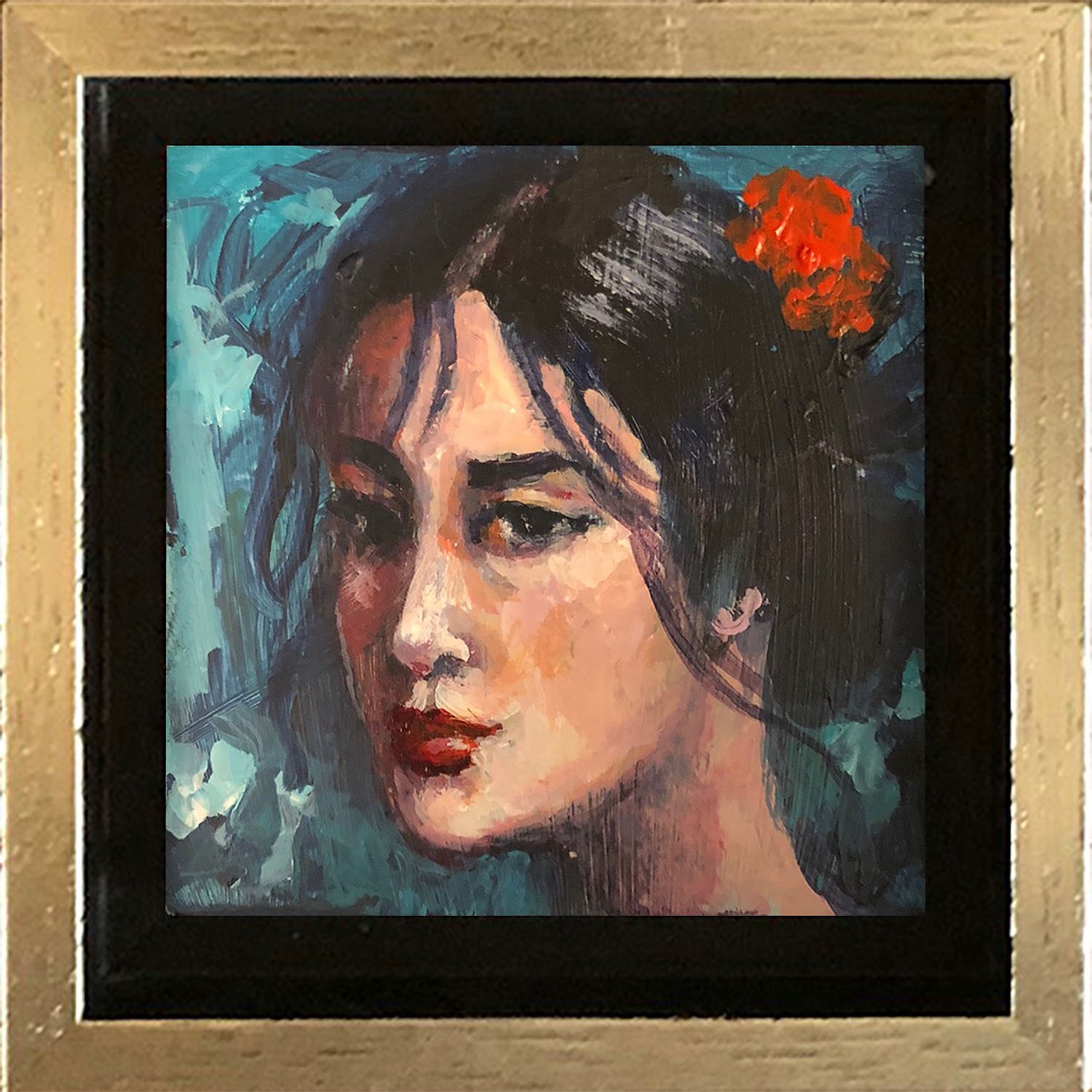 Annemarie de Groot, schilderijtje “Geisha 4”, 10 x 10 cm, acrylverf op paneel, met lijst
